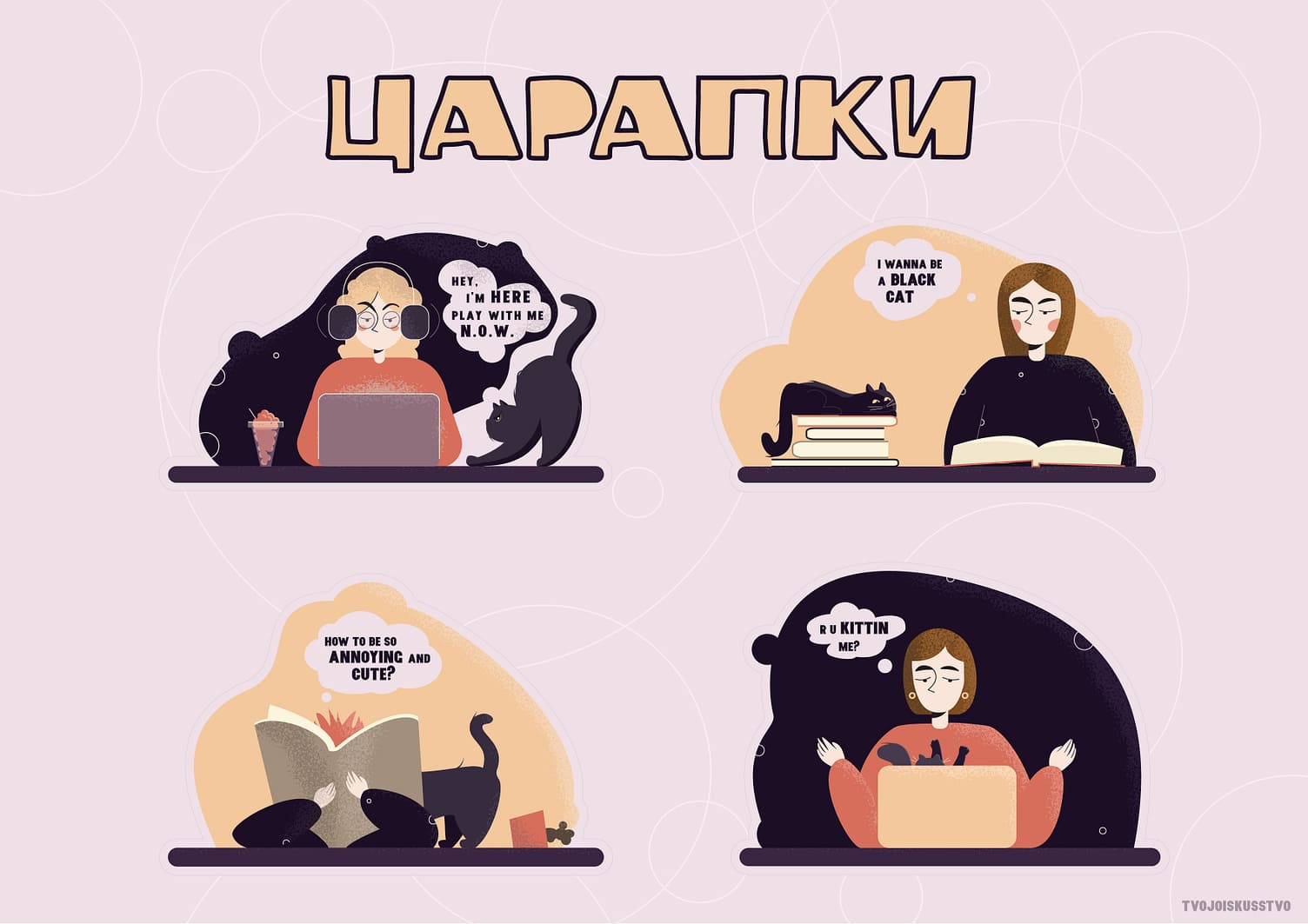 Идея стикерпака про котиков пришла сама и Маша не могла не уделить ей внимания. Сначала она искала референсы, палитру, позы кота, полезные инструменты программ. В итоге получились четыре стикера, на каждом из которых котик мешает, но без него иллюстрация бы не получилась такой забавной и живой! Поэтому и называется набор "Царапки".